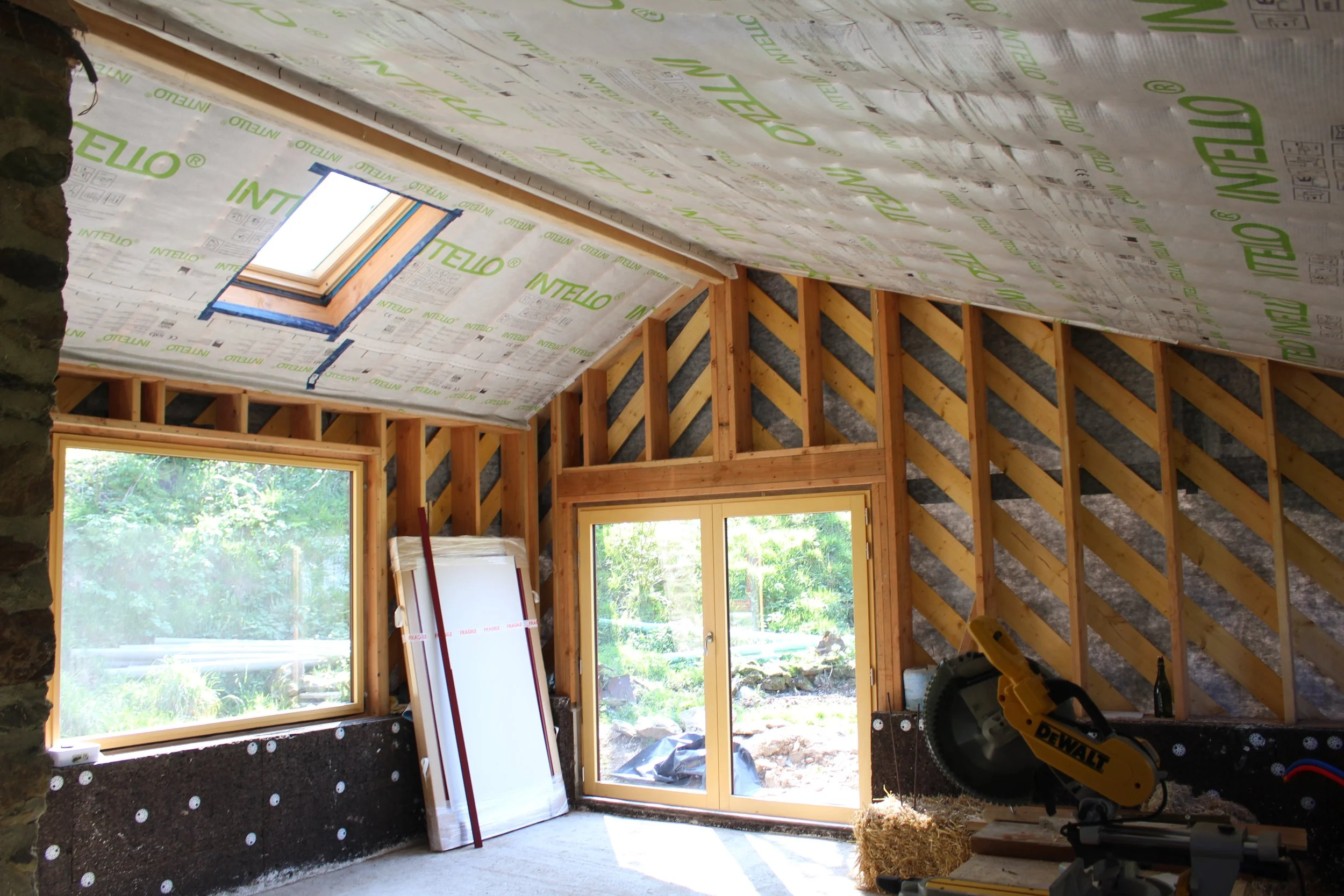 Pose des meunuiseries, soubassement isolé par 10cm de liège. Ossature prète à recevoir l'isolation en botte de paille.