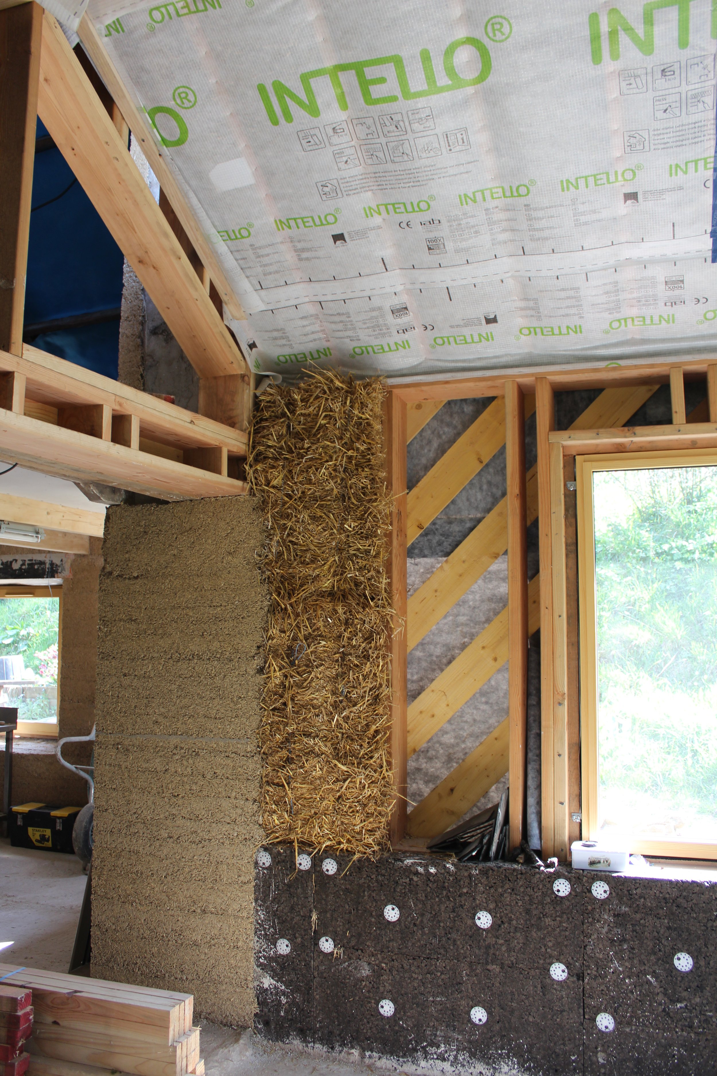 Jonction entre le chaux-chanvre de la partie rénovation et le liege et la paille de l'extension