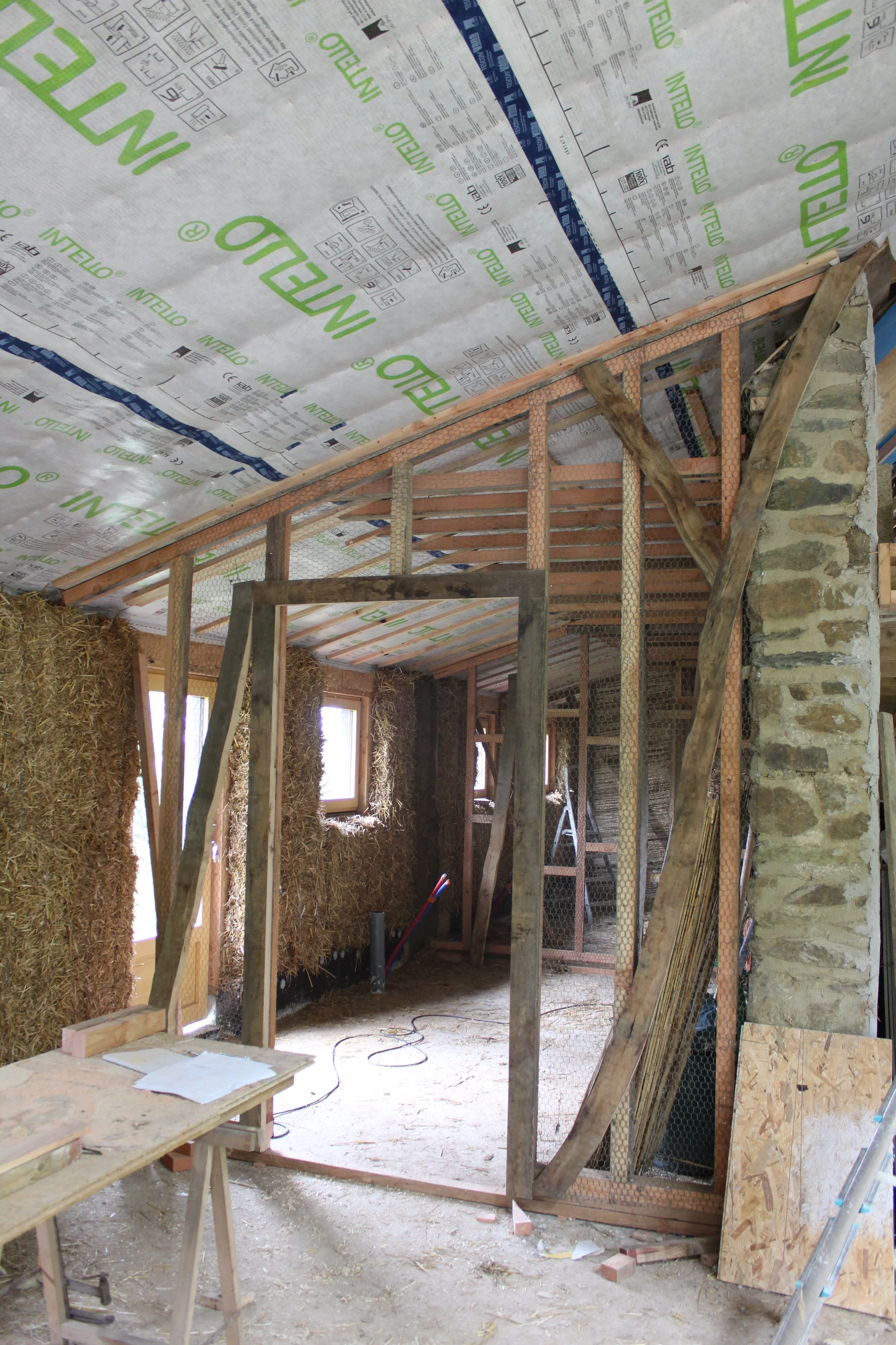 Fabrication d'une cloison style colombage. La toiture est isolée en laine de chanvre et les murs en bottes de pailles.